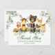Carte de remerciement Baby Shower Animaux de la forêt à l'aquarelle. Les bébés animaux comprennent ours, cerf, élan, raton laveur, lapin, renard et hibou sur feuilles d'eucalyptus et verdure forestière. Écriture verte.