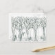 Une carte postale hivernale avec un stylo noir et un dessin à l'encre d'une forêt avec des animaux boisés, y compris des lapins et un cerf dans la neige.