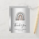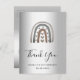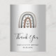 Un carte de remerciements pour un 21e anniversaire (ou tout âge). Un arrière - plan métallique à l'aspect faux argenté. Décoré d'un arc-en-ciel peint minimaliste et abstrait moderne, avec des coeurs. Sur l'avant, grand script en lettres de couleur noire et texte : Merci, votre texte, votre titre et une date.