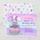 Un gâteau d'anniversaire blanc et rose dessiné à la main et des invitations à la fête d'anniversaire de la fille de ballons.