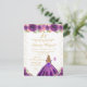 Cette invitation d'anniversaire élégante et glamour met en vedette une belle princesse aux cheveux blonds et à la peau claire portant une robe de bal violet foncé. Le texte associe une écriture manuscrite à des polices sans empattement modernes pour un rendu élégant et sophistiqué. Les arrangements floraux, les papillons et les confettis dorés créent l'assemblage idéal de rustique et de chic.
