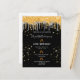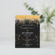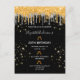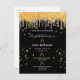 Une invitation moderne, élégante et glamour pour une fête d'anniversaire de 50e femme (ou de n'importe quel âge). Un arrière - plan noir chic avec une élégante goutte d'or et d'argent faux parties scintillant, la peinture goutte à goutte. Décoré de verres, flûtes et bulles. Personnalisez et ajoutez un nom et des détails du parti. Le nom est écrit avec un script de style à la main tendance. Lettres gris clair.