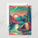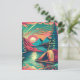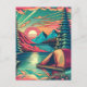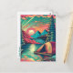 Restez en contact avec cette carte postale mignonne sur le thème du camping. Les graphiques représentent une scène de camping vintage rose et sarcelle avec une tente, un coucher de soleil, un lac et des pins.