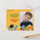 Carte postale d'annonce de fin de maternelle. Fond jaune d'autobus scolaire avec des icônes graphiques de fournitures scolaires. Grande photo centrale (à remplacer). Typographie fantaisiste moderne en plusieurs couleurs inspirées des graphiques. Sophistiqué mais jeune. Annonce de fin de maternelle adorable et excellent souvenir d'une étape spectaculaire dans le parcours éducatif d'un enfant.