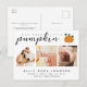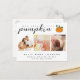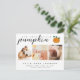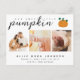 Cette jolie carte d'annonce de naissance de bébé est parfaite pour présenter votre petit bébé d'automne ! Vous pouvez également l'envoyer comme carte de vacances de Thanksgiving et carte de remerciement pour la baby shower ! Le design simple mais élégant présente trois de vos photos de famille préférées et un mélange de typographie moderne et élégante et de script manuscrit. Il y a également une image de citrouille mignonne pour accompagner le texte.