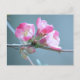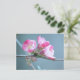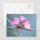 Une photo d'une branche d'un pommier avec des fleurs de pomme rose sur un arrière - plan bleu/gris.