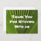 Faites de votre séjour un moment inoubliable et mettez votre location de maison à l'écart de votre concurrence avec cette carte postale bon marché. Cette carte postale promotionnelle présente une photo de la nature qui capture une feuille de palmier vert vif montrant les rainures profondes et ombragées de ce plante tropical. "Merci pour rester avec nous" peut rapidement être customisé si vous le désirez.