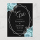 Cette élégante carte de save-the-date de mariage moderne présente un cadre géométrique argenté orné de fleurs aqua et argentées sur fond noir. Le texte personnalisable combine une écriture manuscrite fantaisiste grise argentée, copperplate et polices italiques. Ajoutez votre adresse de retour et d'autres informations au verso.
