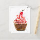 une aquarelle traditionnelle d'un savoureux cupcake à l'allure crémeuse avec garniture crémeuse et une cerise sur une carte postale.