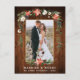 Bois rustique Elégant Aquarelle Hiver Floral Bois nouvellement marié Photo Marié & Joyeux Noël La carte postale comprend de belles poinsettias rouges aquarelle, verdure botanique, feuillage hivernal, baies sèches, roses blanches, coton, cônes de pin et baies bleues. Bois rustique. Cadre Or.