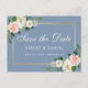 Aquarelle Rose Blanc Floral Dusty Bleu Enregistrer la date Faire-part Fiançailles La carte postale comprend roses roses, fleurs blanches et verdure botanique sur un cadre doré.