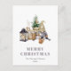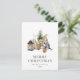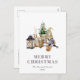 Cette carte postale de vacances rustique et confortable présente une aquarelle illustrant un mignon gnome féminin assis à côté d'un sapin miniature, d'un panier de billes de bouleau et de quelques bougies. Les mots "MERRY CHRISTMAS" apparaissent dans des lettres serif grises qui se coordonnent avec l'art. Ajoutez le nom de votre famille et l'année à l'avant en italique gris fusain, et votre adresse de retour et un bref message au verso.