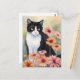 Envoyez un message joyeux avec cette carte postale avec un tableau aquarelle d'un mignon chat tuxedo entouré de fleurs de marguerite gerbera vives. Parfait pour partager une touche de joie et de charme floral avec des amis et des proches.