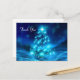 Carte de remerciement avec un sapin de Noël électrique bleu moderne. Décoré de lumières tout autour. Le fond comporte des lumières floues délavées.