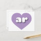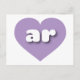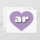 Cette carte postale présente un coeur de lavande cool contenant des lettres coques inférieures blanches, arrondies et audacieuses, une version ludique de l'abréviation Arkansas, l'état naturel. Le verso de la carte est vide, en attendant vos sentiments manuscrits ou le texte customisé.
