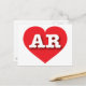 Cette carte postale est dotée d'un coeur rouge vif contenant les lettres coques AR, en haut blanc et audacieuses, l'abréviation officielle de Arkansas, l'état naturel. Le verso de la carte postale est vide, en attendant vos sentiments manuscrits ou le texte customisé.
