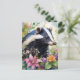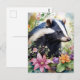 La carte postale présente un portrait floral aquarelle d'une peau qui donne sur le côté. OEuvre colorée de nature botanique avec une créature forestière noire et blanche !