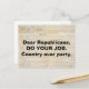 Chers Républicains, FAITES VOTRE TRAVAIL. Pays au lieu de fête. Texte noir sur un arrière - plan de l'article I et du préambule Nous le peuple de la Constitution. Écrivez votre représentant. Dites-leur de faire leur travail.