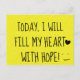 Il s'agit d'une carte postale mignonne et très "heureuse", jaune vif, avec une affirmation joyeuse qui dit : "AUJOURD'HUI, JE REMPLIRAI MON COEUR D'ESPOIR !" écrite en lettres noires géantes à côté d'un coeur noir mignon et d'un visage heureux ! Enchanté de vous faire un grand sourire et de remplir votre coeur d'espoir chaque jour !