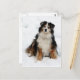 A beautiful black tri colored purebred Australian Shepherd breed of herding dog, sitting in the snow. Her thick double coat insultates her from the cold weather, even though the snow clumps to her vest and leg hair.