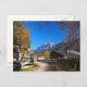 Carte postale avec un paysage rural avec une route, une grange et des arbres aux couleurs de l'automne et une vue sur les montagnes Geisler ou Odle dolomites en automne dans la vallée du Val di Funes au Tyrol du Sud, Italie.