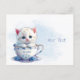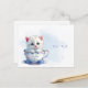 Carte postale avec chaton dans une tasse fleurs bl