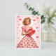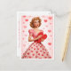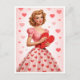 Envoyez un peu de romance à l'ancienne avec cette charmante carte postale vintage de Saint-Valentin pin-up. Avec une illustration classique des années 50 d'une femme glamour dans une robe rose à motifs de cœurs, tenant doucement un cœur de Saint-Valentin à pois, ce design capture la féminité intemporelle et l'amour nostalgique.