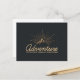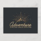 Carte postale avec illustration de couleur or sur un arrière - plan gris-noir. Conçu avec une illustration d'une montagne avec les rayons de soleil brillant vers l'extérieur de derrière. La typographie dit : Aventure explorer la découverte de rêve.
