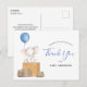 Merci à vos invités de célébrer la maman à être! Cette carte postale de remerciement comporte un éléphant aquarelle avec un ballon bleu assis sur une pile de boîtes de livraison. Correspond à notre baby shower d'éléphants par la collecte de courrier. Personnalisez avec vos informations ou cliquez sur "Cliquez pour customiser plus loin" pour modifier les styles, la taille et les couleurs des polices.