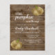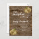 Cette invitation baby shower moderne et neutre pour les femmes comprend une paire de citrouilles de parties scintillant d'or et de confettis d'or sur un arrière - plan rustique de grange brune. Les mots "Un petit citrouille est en route !" apparaissent en écriture blanche. Personnalisez-le avec le nom de la maman-to-be en écriture blanche et les détails du baby shower en police blanche sans serif. Idéal pour un baby shower d'automne !