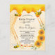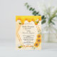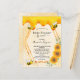 Un baby shower d'été amusant par invitation postale. Un arrière - plan jaune avec un motif de nid d'abeille. Avec un cadre géométrique en faux or et miel doux qui dégouline. Décoré de tournesols jaunes et oranges et d'abeilles bourdonnantes. Une petite abeille porte une enveloppe. Avec le texte : Baby shower par la poste. Personnalisez et ajoutez le nom de la mère à écrire avec un script de style manuscrit moderne. Lettres noires. Retour : motif jaune nid d'abeille, design de carte postale. Conseil : Si vous ne voulez pas qu'il ressemble à une carte postale, cliquez sur customiser, allez à l'arrière et retirez le séparateur et le timbre postal.
