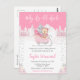 Cette invitation à baby shower d'aquarelle mignonne et amusante présente un adorable ours dans un traîneau rose entouré de neige, de montagnes et de pins. Le texte combine écriture manuscrite et polices sans serif pour un look élégant et moderne. De belles compositions de fleur en faux parties scintillant et des confettis argentés apportent une touche festive. C'est parfait pour un baby shower de Noël ou d'hiver. Graphiques par www.etsy.com/uk/shop/SunflowerDayLove