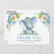 Carte de remerciement Baby Shower Éléphant Floral Bleu Aquarelle. Comprend de belles fleurs bleues et blanches aquarelle avec feuillage botanique et fougères.