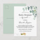 Pour un Baby shower par la poste. Un arrière - plan blanc chic. Décoré de verdure blanche d'eucalyptus, de feuilles et de sprigs, et d'une jolie abeille souriante portant une enveloppe. Personnalisez et ajoutez un nom et des détails du parti. Lettres noires. Le texte : Baby shower et le nom de la mère à abeilles sont écrits avec un script de style manuscrit moderne. Retour : couleur arrière - plan verte et l'abeille souriante. Conception de carte postale. Non sexiste. Conseil : Si vous ne voulez pas qu'il ressemble à une carte postale, cliquez sur customiser, allez à l'arrière et retirez le séparateur et le timbre postal.