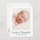 Exprimez votre gratitude avec style avec la carte de remerciementement de baby shower Simple Love and Thanks Typography ! Dotée d'un design épuré avec une photo, cette carte personnalisable est parfaite pour mettre en valeur la photo adorable de votre petit tout en remerciant vos amis et votre famille. Une façon sincère et moderne de partager votre appréciation. Un style frais et épuré avec le nom de bébé et les informations de naissance. Icône de détail en forme de cœur. ©lddesignloft Contactez info@lddesignloft.com si vous avez besoin d'aide avec ce modèle.