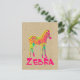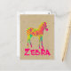 Carte postale avec une illustration psychédélique de style années 60 funky d'un bébé zèbre aux couleurs néon jaune vif, rose chaud et vert menthe. Sauvage et exotique avec une touche artistique créative.