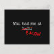 Que vous soyez amateur de bacon ou gourmand, ce design baconisé vous transportera dans un état croustillant, croquant, délicieux, gras, lard, état de bonheur extrême. Commencez votre propre bacon du mois club avec ces délicieux cadeaux de bacon comme des chemises à bacon pour femmes, des chemises à bacon pour hommes, des chemises à bacon pour enfants et des sweatshirts de bacon. Envoyez des cadeaux de lard à tous ceux qui aiment le lard. Offrez-vous un gâteau sucré et achetez un cadeau de lard pour vous tous les mois ! Faites un t-shirt bacon, une cravate de bacon, une tasse de bacon, un casquette bacon, un tapis de souris bacon, un sac fourre-tout bacon, un porte - clé bacon, un autocollant bacon, une tresse de chien bacon ou un tablier BBQ bacon partie de votre panier cadeau bacon. Envoyez une carte postale de bacon ou une carte de voeux de bacon à votre ami pour partager vos voyages de bacon. Les Bachontariens sont salés, sadiques et sensuels. Montrez au monde votre dépendance au bacon avec un t-shirt bacon, des cadeaux bacon, coque iphone bacon, coque ipad bacon ou sweat - shirt à capuche bacon. Le bacon est un bonbon pour homme, le bacon est un bonbon pour la viande, le bacon est un barbecue. J'adore le lard. Bacon améliore tout. Achète du bacon maintenant ! Description de l'image : un dessin en noir et blanc avec les mots "you had me at hello" avec le mot "hello" croisé et le mot "bacon" remplacé en rouge.