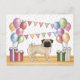 L'illustration de dessin animé originale de Destei d'un chien de race Carlin de couleur robe faon adorable. Le chien est placé dans un cadre d'anniversaire coloré avec des ballons d'anniversaire de couleur pastel, des cadeaux et une banderole à fanions. Les couleurs pastel comprennent le rose, le vert, le bleu, le rouge, l'orange et le violet. Le chien est debout sur une texture de plancher en bois jaune et le fond a un motif de pois de couleur pastel ludique.