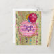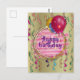 Célébrez le jour spécial de votre proche avec cette carte postale festive d'anniversaire ! Le fond métallisé or est orné de rubans colorés, créant une atmosphère joyeuse. Le point central de la carte est un cercle à cadre métallisé or et à coups de pinceau roses avec « Joyeux Anniversaire » écrit en élégante écriture cursive violette. Trois ballons en rose, violet et bleu flottent dans le coin supérieur droit, ajoutant à l'ambiance de célébration. Personnalisez cette carte postale pour en faire la surprise d'anniversaire parfaite !