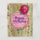 Célébrez la journée spéciale de votre proche avec cette carte postale festive d'anniversaire ! Le fond métallisé or est orné de rubans colorés, créant une atmosphère joyeuse. Le point central de la carte est un cercle à cadre métallisé or et à coups de pinceau roses avec « Joyeux Anniversaire » écrit en élégante écriture cursive violette. Trois ballons en rose, violet et bleu flottent dans le coin supérieur droit, ajoutant à l'ambiance de célébration. Personnalisez cette carte postale pour en faire la surprise d'anniversaire parfaite !