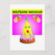 Une banane de dessin animé soufflant les bougies sur le gâteau d'anniversaire. Illustration disponible sur divers cadeaux et produits.