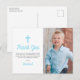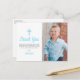 Remerciez votre famille et vos amis d'avoir assisté au premier anniversaire et au baptême de votre bébé garçon avec une photo de votre enfant. Le design bleu présente des pois blancs sur un fond d'aquarelle bleue au dos de la carte. Tout le texte peut être personnalisé, y compris le nom de votre enfant et le message.