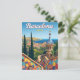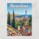 Celebrate the vibrant art and architecture of Barcelona, Spain, with this stunning vintage-style postcard. The design captures the unique, colorful mosaic walls and distinctive architecture of Park Güell (a tribute to Gaudí), overlooking the beautiful Mediterranean coastline and the red-roofed city. This travel poster is perfect for lovers of Spanish culture, Gaudi's work, and sunny European city views. Ideal for sending greetings, keeping as a colorful souvenir, or framing as sophisticated wall art.