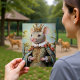 A diminutive mouse, positioned centrally within a vertical portrait frame, is the charming subject. The mouse has grey/brown fur, small features, and wears an elaborate gold crown and a lavish white ruffled collar. It is dressed in a dark blue/green coat adorned with gold trim and a prominent red sash, indicative of Baroque royal fashion. The background is dark, rich, and features subtle patterned embellishments. The artwork is rendered in a highly detailed, painterly style, utilizing soft lighting to emphasize the textures of the fur and the intricate regalia. The overall atmosphere is elegant, unique, and whimsical.