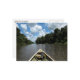 Un bateau déambule sur une rivière dans la jungle amazonienne sous des nuages bouffants dans un ciel bleu.