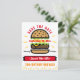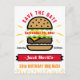 Annoncez votre fête d'anniversaire BBQ à votre famille et à vos amis avec cette carte postale faire-part personnalisée adaptée à tous les âges, avec une illustration moderne d'un hamburger avec flammes en rouge, orange, jaune, marron et noir sur un arrière - plan blanc avec typographie colorée en caractères gras. Personnalisez-le avec tous les détails dont vous avez besoin pour invitation vos invités, y compris le nom, l'âge, le jour, la date et l'occasion sur la couverture et des informations supplémentaires avec les adresses et les détails RSVP au dos. Conçu par © Tim Coffey.