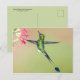 Carte postale montrant le magnifique colibri en raquettes vert métallique de l'Equateur volant vers une fleur avec ses ailes larges ouvertes et ses longues plumes de queue déployées gracieusement derrière lui. En plus de ses magnifiques plumes de queue en forme de raquette, ce petit colibri andin spectaculaire a des bottes de pattes blanches bouffantes. Grande carte pour colibri, nature et amoureux de les jardins ! Photo prise à Tandayapa, Equateur.