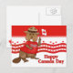 Le design canadien amusant présente des vagues rouges ondulées et un arrière - plan de feuilles d'érable. Un beau castor dans un Casquette montagnard agite un drapeau canadien. Le texte dit... Bonne fête du Canada