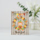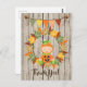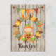 Cette carte de remerciement d'automne présente un bébé mignon habillé en costume de citrouille assis dans une couronne de feuilles d'automne colorées. Il y a également une banderole avec des glands et un fond en bois faux.