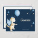 Précieuse carte de remerciement pour baby shower en espagnol pour remercier vos invités de leurs cadeaux. La carte postale a un magnifique fond bleu marine où l'illustration d'un bébé dragon avec des ailes bleues tient un ballon en forme d'hélium bleu clair. Pour compléter l'illustration, il y a des étoiles bleues et des cercles jaunes éparpillés ici et là.